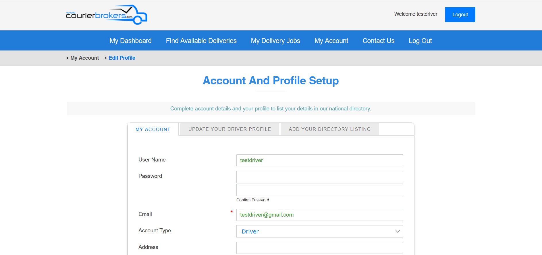 2. In the Account and Profile Setup screen, edit your information under My Account, Driver Profile, Directory Listing tabs
